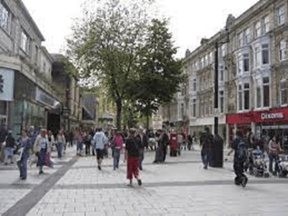 Enter Queens Street, which is the main pedestrianised shopping street, noting the high street shops, shopping centres and various arcades.