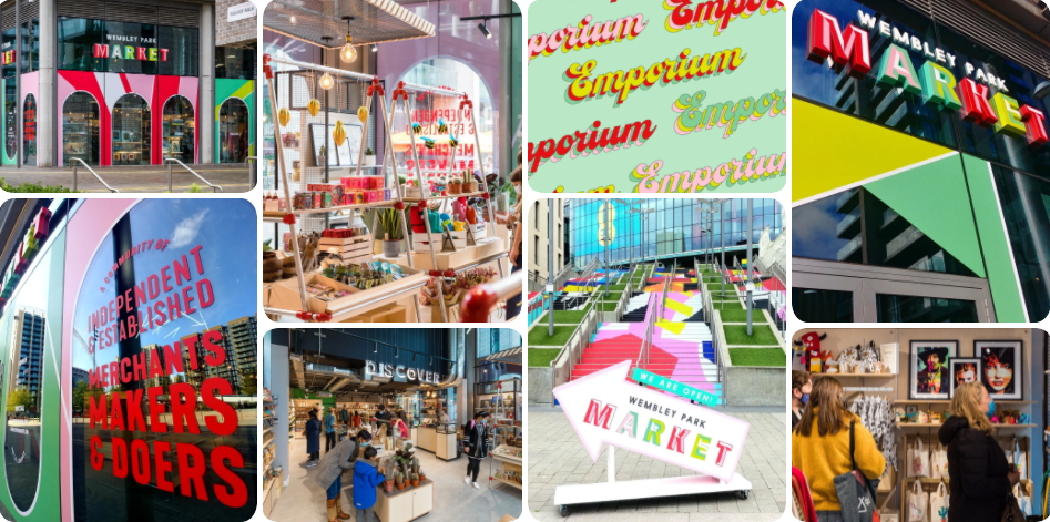 You will walk past Emerald Gardens and The Yellow Community Centre on your left. Continue walking along Exhibition Way, past Wembley Park Market.